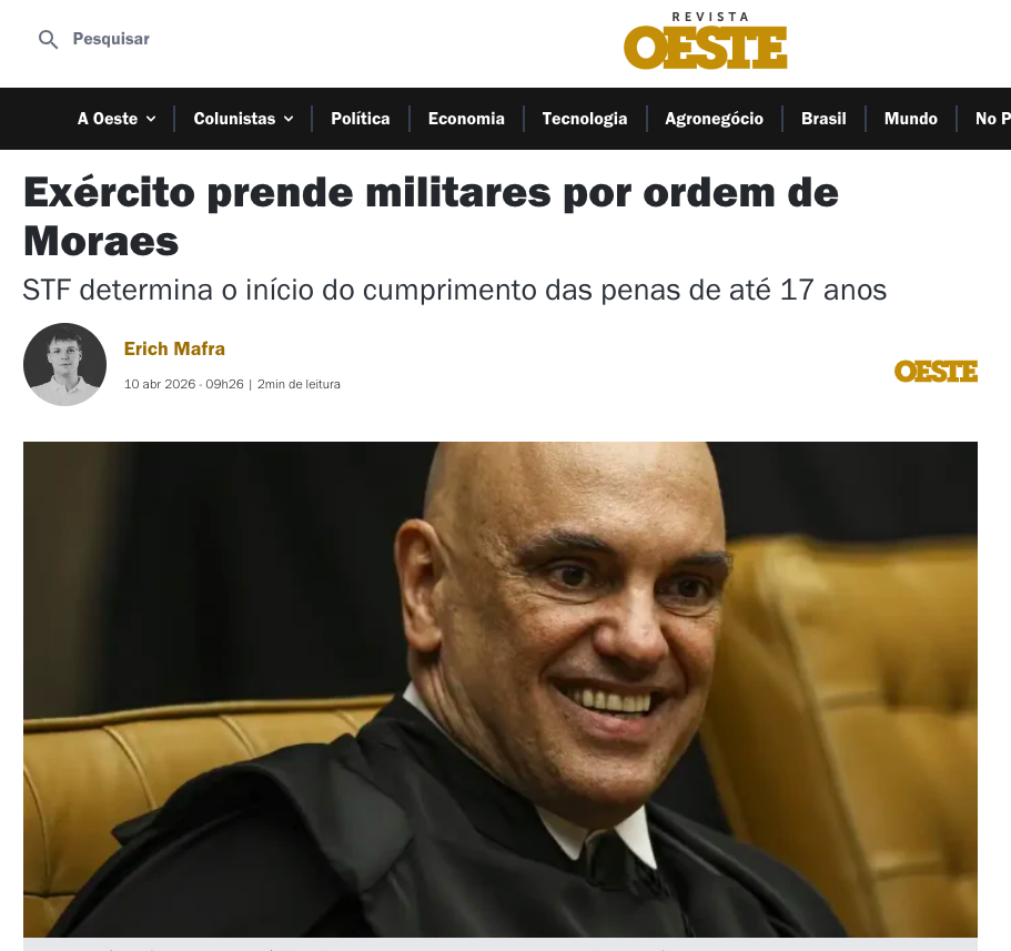 O Exército Brasileiro prendeu três militares na manhã desta sexta-feira, 10 de abril de 2026, atendendo a ordem do ministro Alexandre de Moraes, do Supremo Tribunal Federal (STF). A determinação ocorreu após a Corte rejeitar os primeiros recursos contra as condenações por suposta tentativa de golpe de Estado, relacionadas ao núcleo de disseminação de informações falsas sobre as urnas eletrônicas, de acordo com a matéria da Revista Oeste.