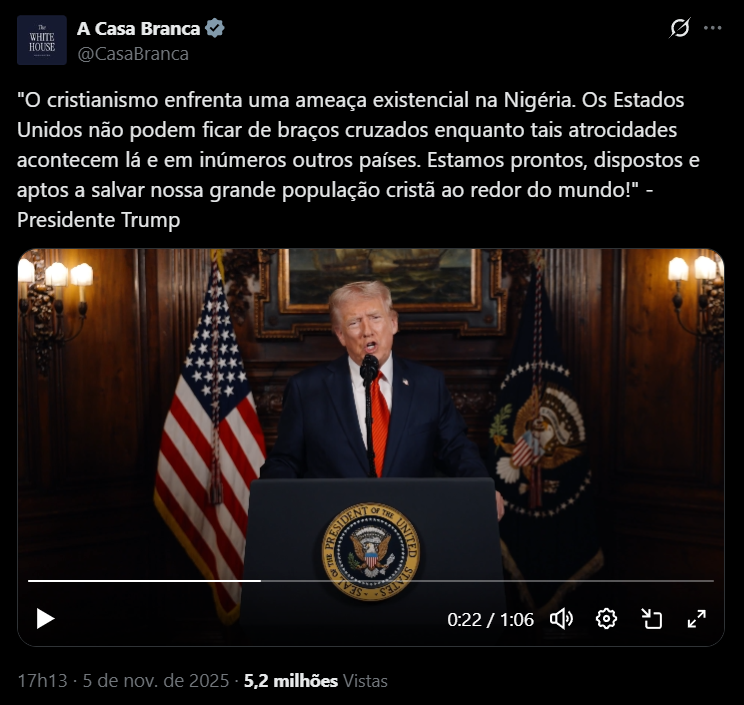 O último desenvolvimento ocorreu depois que Trump escreveu em sua plataforma Truth Social, no sábado, que se o governo nigeriano “continuar permitindo o assassinato de cristãos”, Washington cortaria imediatamente toda a ajuda.