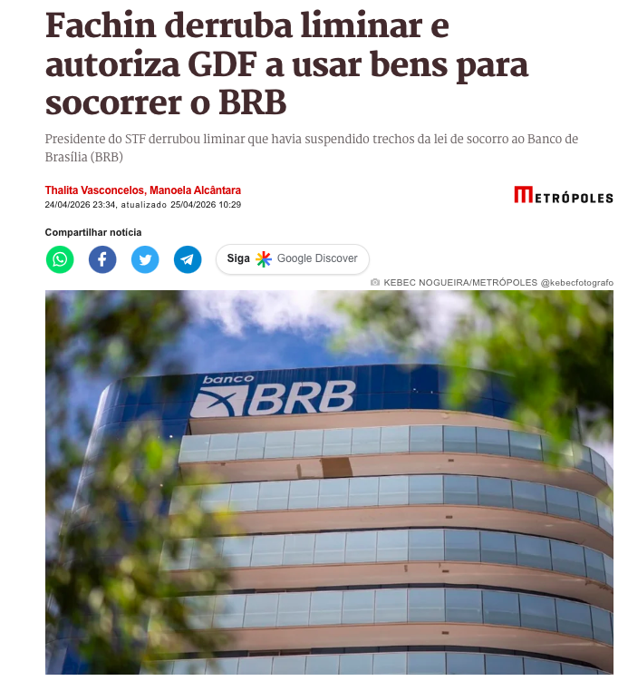 Segundo a apuração da coluna de Manoela Alcântara, o presidente do STF derrubou liminar que havia suspendido trechos da lei de socorro ao BRB, permitindo que o plano de capitalização siga adiante sem novos impedimentos imediatos.
