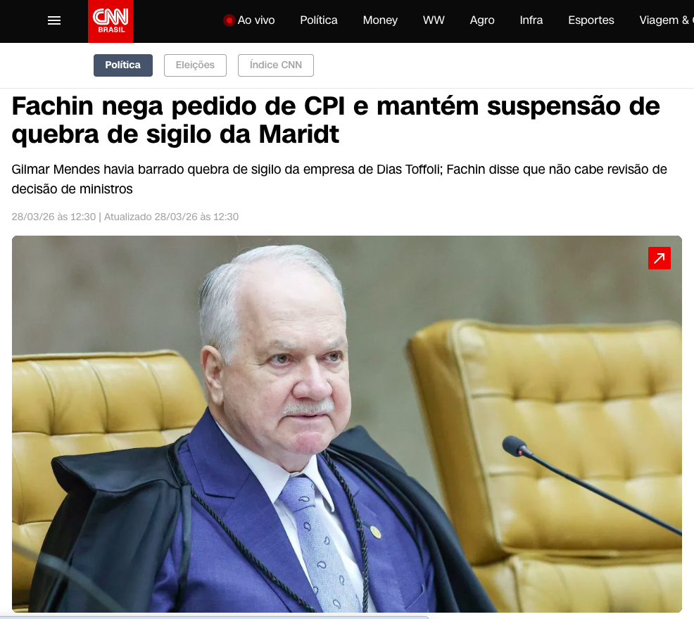 O ministro Edson Fachin, presidente do Supremo Tribunal Federal (STF), negou pedido da CPI do Crime Organizado e manteve a suspensão da quebra de sigilo da empresa Maridt, que tem entre seus sócios o ministro Dias Toffoli, de acordo com a matéria da CNN BRASIL.