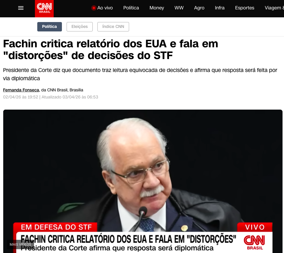 O ministro Edson Fachin, presidente do Supremo Tribunal Federal (STF), criticou na quinta-feira (2 de abril) um relatório do Congresso dos Estados Unidos que aponta supostas violações à liberdade de expressão no Brasil, especialmente decisões relacionadas à remoção de conteúdos em redes sociais, de acordo com a matéria da CNN BRASIL.