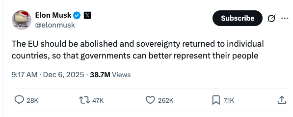 “A UE deveria ser abolida e a soberania devolvida aos países individuais, para que os governos possam representar melhor seus cidadãos”, escreveu Musk em sua conta no X, que conta com aproximadamente 230 milhões de seguidores.
