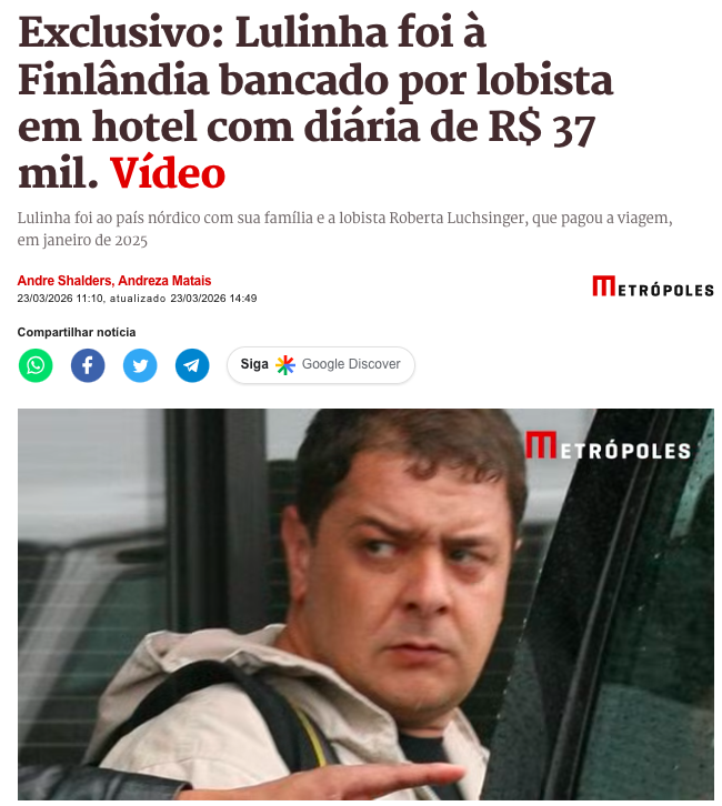 O empresário Fábio Luís Lula da Silva, conhecido como Lulinha e filho do petista Lula da Silva, realizou uma viagem de luxo à Noruega e à Finlândia em janeiro de 2025, com todas as despesas custeadas pela lobista Roberta Luchsinger. O objetivo era observar a aurora boreal com a família, em uma experiência organizada pela influenciadora de turismo de alto padrão Marina Mantega, filha do ex-ministro Guido Mantega, de acordo com a matéria do Metrópoles.