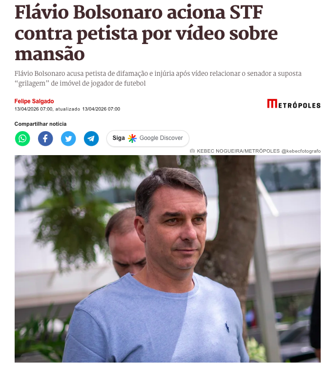 O senador Flávio Bolsonaro (PL-RJ) protocolou no Supremo Tribunal Federal (STF) uma queixa-crime contra o deputado federal Rogério Correia (PT-MG). A ação foi motivada por um vídeo publicado pelo petista que relaciona o senador a uma disputa judicial envolvendo uma mansão avaliada em R$ 10 milhões, localizada em Angra dos Reis (RJ), de propriedade do jogador de futebol Richarlison, de acordo com a matéria do Metrópoles.