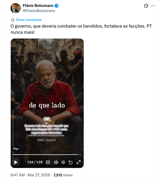 “O governo, que deveria combater os bandidos, fortalece as facções. PT nunca mais!”, disse Flávio Bolsonaro.