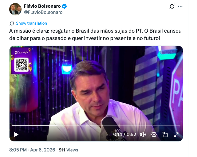 Em publicação nas redes sociais neste domingo (5 de abril de 2026), Flávio Bolsonaro afirmou: “A missão é clara: resgatar o Brasil das mãos sujas do PT. O Brasil cansou de olhar para o passado e quer investir no presente e no futuro!”, confira a postagem: