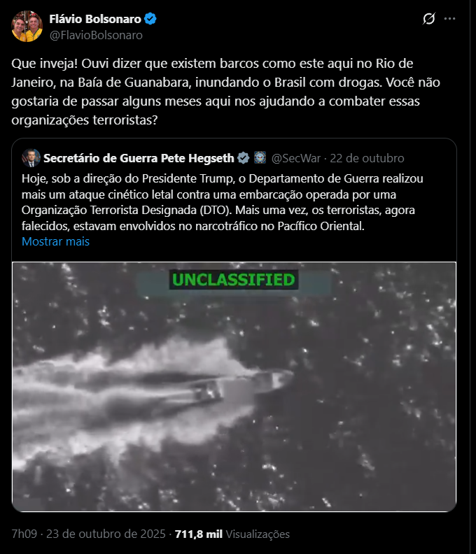 Na publicação, Hegseth compartilha um vídeo do momento do ataque. Ao repostar o conteúdo, Flávio escreveu “que inveja”.