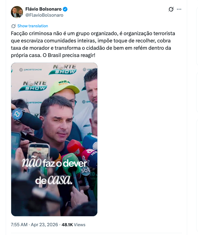 A fala do senador ocorre em um momento em que o Congresso Nacional discute projetos de lei que visam endurecer as penas para crimes cometidos por milícias e narcotraficantes. Flávio argumenta que a estrutura dessas organizações, que inclui o controle territorial e a imposição de leis próprias, exige que as forças de segurança tenham respaldo jurídico para uma atuação mais agressiva.
