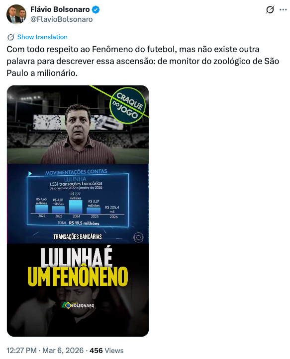 Flávio Bolsonaro faz referência ao início da carreira de Lulinha como monitor no Zoológico de São Paulo e contrasta com as movimentações financeiras reveladas pela quebra de sigilo bancário aprovada pela CPMI do INSS: repasses de R$ 19,3 milhões em uma única conta entre 2022 e 2025, incluindo transferências do próprio Lula, de Paulo Okamotto e pagamentos a figuras como Jonas Suassuna (caseiro do sítio de Atibaia) e Kalil Bittar (alvo da PF por suspeito lobby no MEC).