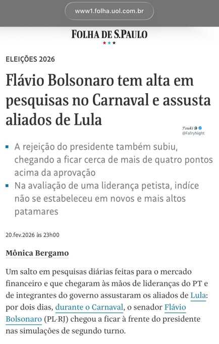 Pesquisas diárias encomendadas pelo mercado financeiro revelaram um cenário preocupante para o governo: durante dois dias do Carnaval, o senador Flávio Bolsonaro (PL-RJ) apareceu numericamente à frente do petista Lula da Silva em simulações de segundo turno para as eleições de 2026. Os dados, que circularam entre lideranças do PT e integrantes do Planalto, causaram surpresa e preocupação nos aliados do petista.