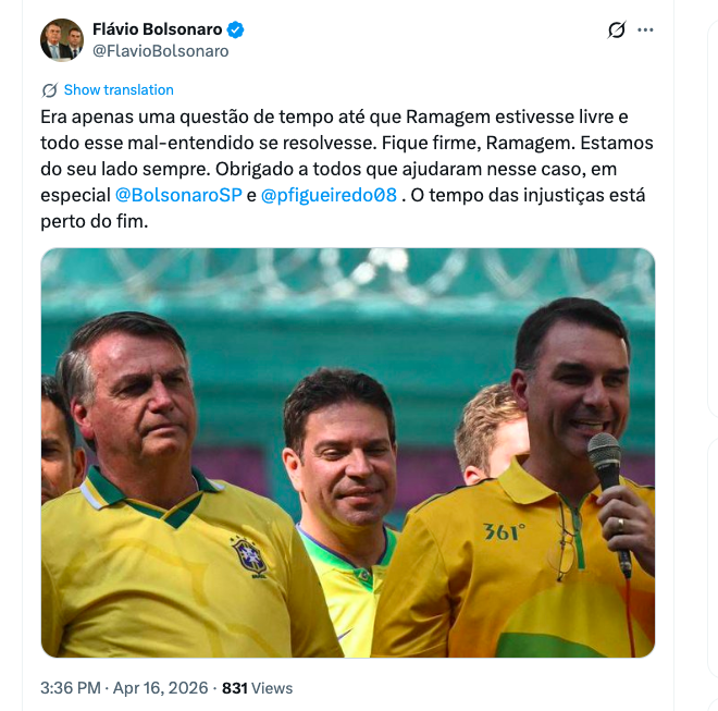 “Era apenas uma questão de tempo até que Ramagem estivesse livre e todo esse mal-entendido se resolvesse. Fique firme, Ramagem. Estamos do seu lado sempre. Obrigado a todos que ajudaram nesse caso, em especial Eduardo Bolsonaro e Paulo Figueiredo. O tempo das injustiças está perto do fim.”