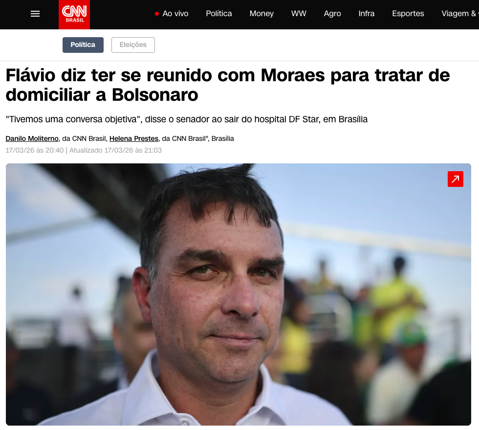 O senador Flávio Bolsonaro (PL-RJ) confirmou que se reuniu pessoalmente com o ministro Alexandre de Moraes, do Supremo Tribunal Federal (STF), para tratar do pedido de prisão domiciliar do presidente Jair Bolsonaro (PL). O encontro reservado foi revelado pelo próprio parlamentar em declaração pública e nas redes sociais, de acordo com a matéria da CNN BRASIL.