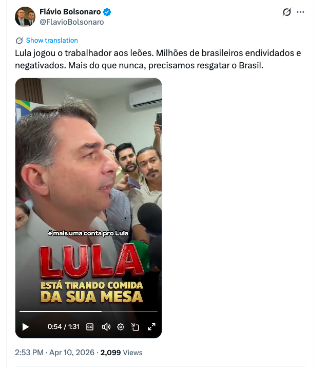 “Lula jogou o trabalhador aos leões. Milhões de brasileiros endividados e negativados. Mais do que nunca, precisamos resgatar o Brasil.”