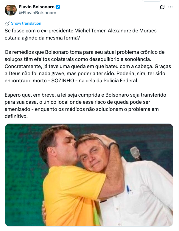 “Os remédios que Bolsonaro toma para seu atual problema crônico de soluços têm efeitos colaterais como desequilíbrio e sonolência. Concretamente, já teve uma queda em que bateu com a cabeça. Graças a Deus não foi nada grave, mas poderia ter sido. Poderia, sim, ter sido encontrado morto – SOZINHO – na cela da Polícia Federal.”
