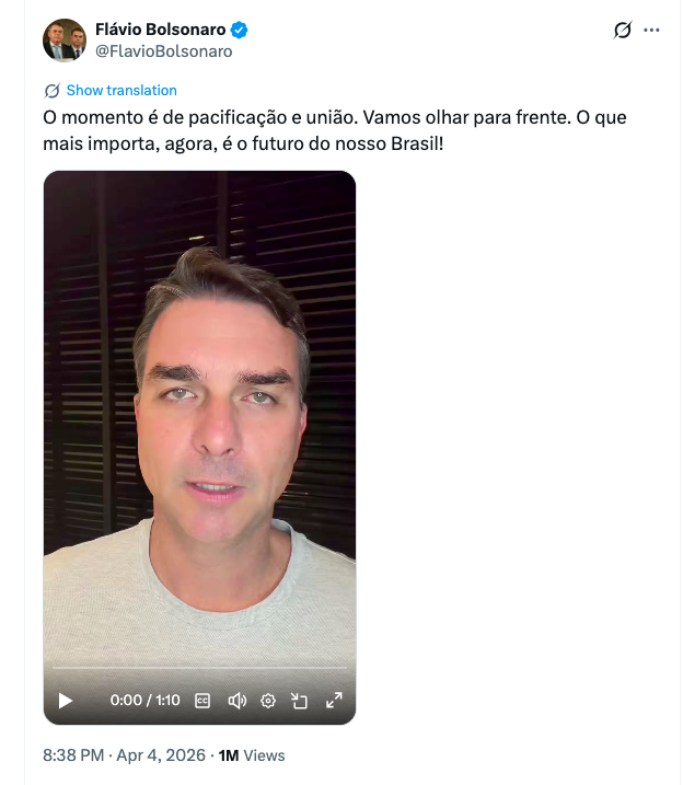 O senador Flávio Bolsonaro (PL-RJ), pré-candidato à Presidência da República nas eleições de 2026, fez um apelo público por pacificação e união entre as lideranças da direita brasileira. Em vídeo divulgado nas redes sociais no sábado (4 de abril de 2026), o parlamentar destacou a necessidade de superar divergências internas e concentrar esforços no que considera essencial para o país.