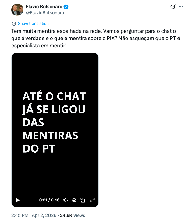 Em publicação, o filho mais velho do presidente Jair Bolsonaro afirmou: “Tem muita mentira espalhada na rede. Vamos perguntar para o chat o que é verdade e o que é mentira sobre o PIX? Não esqueçam que o PT é especialista em mentir!”, confira a postagem: