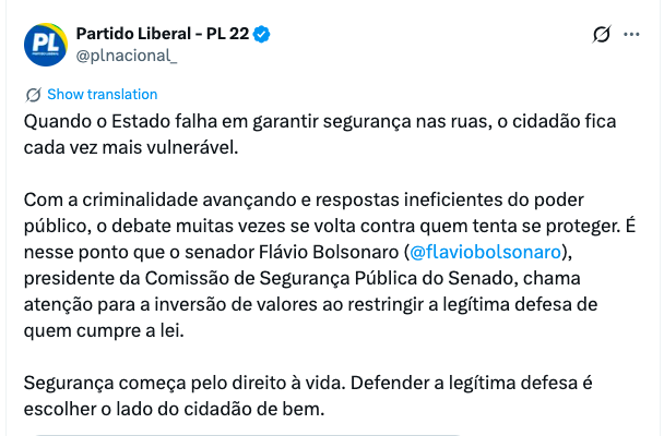 Na publicação, o PL afirma: “Quando o Estado falha em garantir segurança nas ruas, o cidadão fica cada vez mais vulnerável.”
