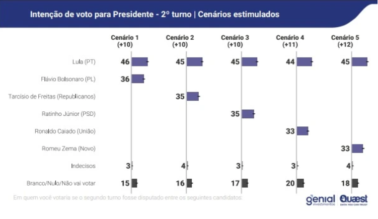 Assim como as projeções do prineiro turno, o petista Lula aparece como o principal nome.