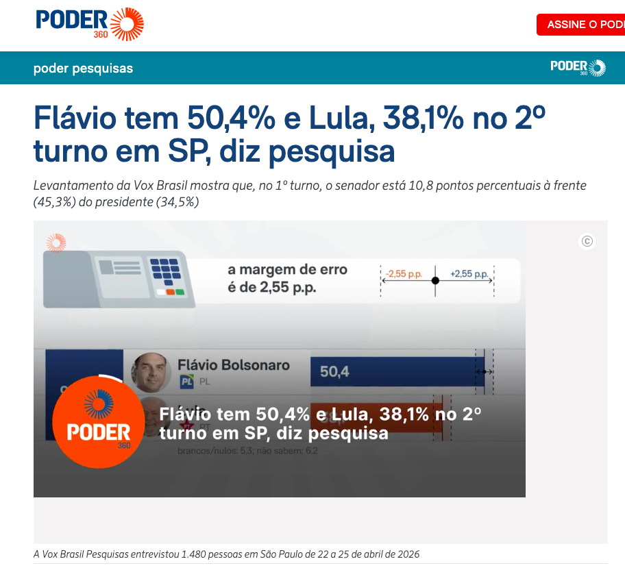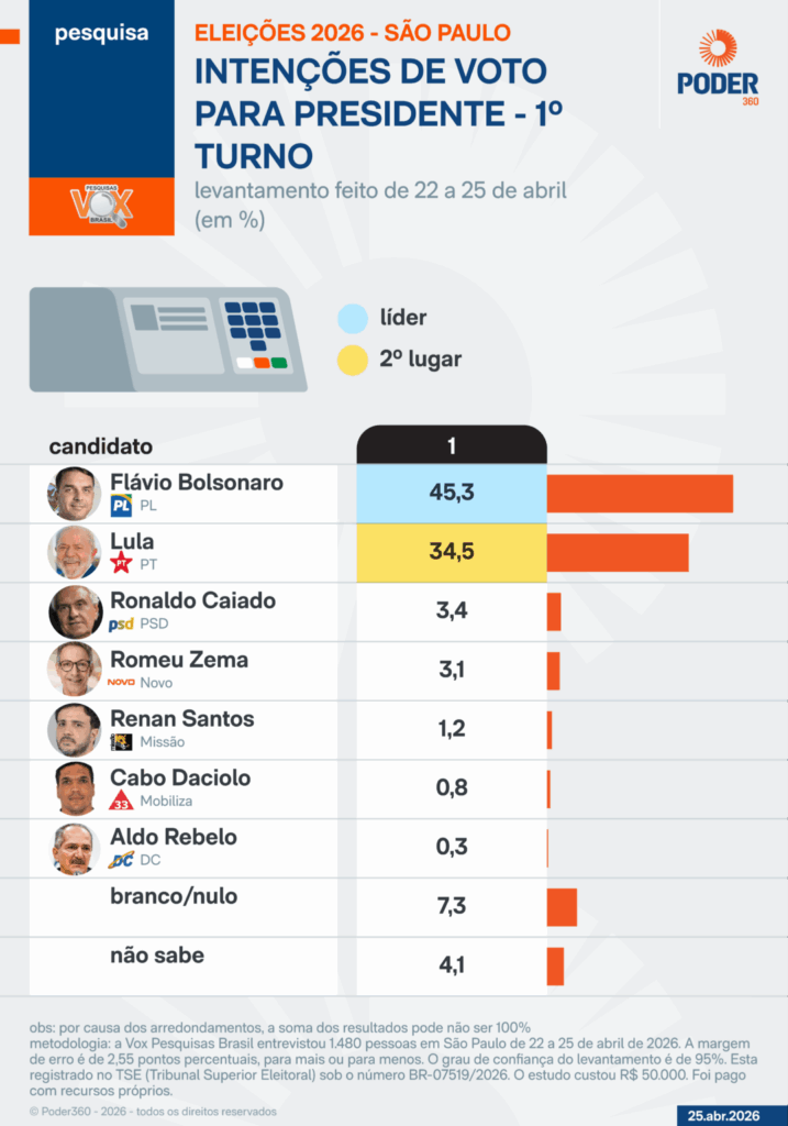 A pesquisa foi realizada pelo instituto Vox Brasil Pesquisas entre os dias 22 e 25 de abril de 2026, ouvindo 1.480 eleitores no estado de São Paulo. A margem de erro é de 2,55 pontos percentuais para mais ou para menos, com intervalo de confiança de 95%. O levantamento está registrado no TSE sob os números BR-07519/2026 e SP-08703/2026.