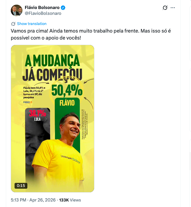 Home / Política / Flávio lidera pesquisa em São Paulo e venceria Lula no 2º turno com 50,4% dos votos