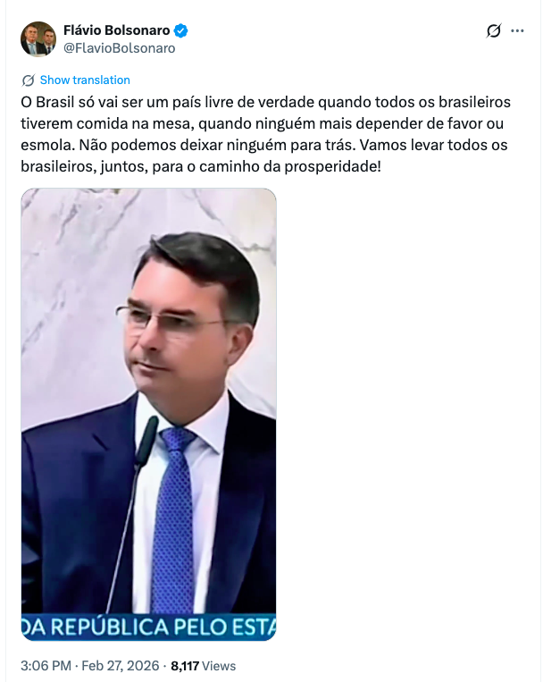 O governador Tarcísio de Freitas, em seu pronunciamento, exaltou Flávio como “futuro presidente do Brasil”, destacou que ele “fará a diferença” e mencionou um “excelente papo sobre o Brasil” que tiveram pela manhã no Palácio dos Bandeirantes.