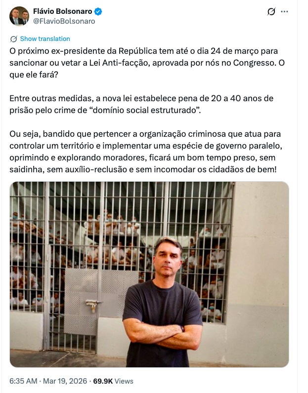 Em postagem que ganhou rápida repercussão, o parlamentar destacou o prazo final e questionou a decisão do Palácio do Planalto: “O próximo ex-presidente da República tem até o dia 24 de março para sancionar ou vetar a Lei Anti-facção, aprovada por nós no Congresso. O que ele fará?”