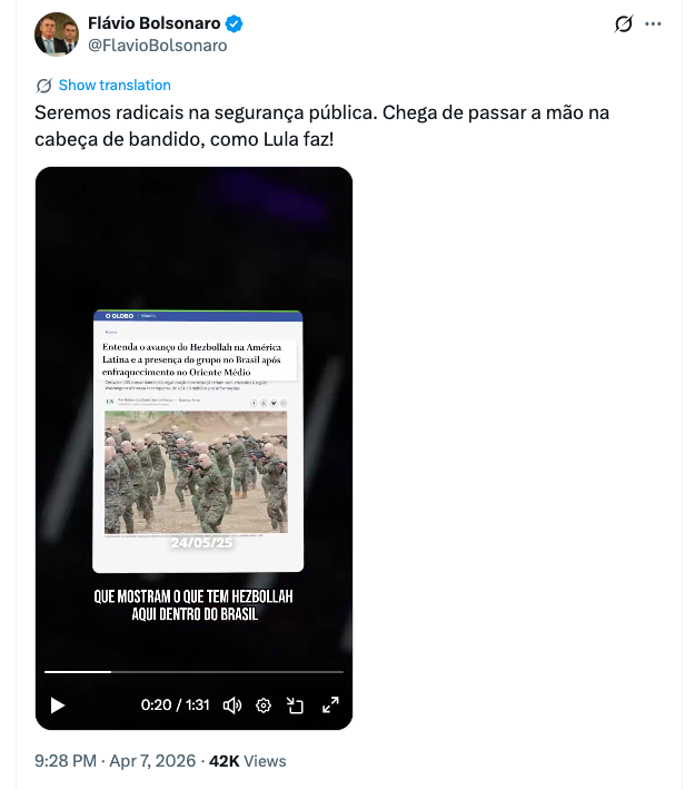 Em publicação nas redes sociais nesta quarta-feira (8 de abril de 2026), Flávio Bolsonaro afirmou que seu eventual governo será “radical” na área de segurança pública e fez duras críticas à abordagem do presidente Lula, confira a declaração: