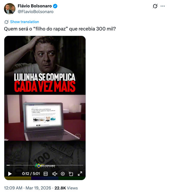O senador Flávio Bolsonaro (PL-RJ) voltou a usar as redes sociais para pressionar por transparência em investigação sensível, questionando diretamente a identidade de um beneficiário de repasses mensais elevados. Em postagem recente, o parlamentar escreveu: “Quem será o filho do rapaz que recebia R$ 300 mil?”