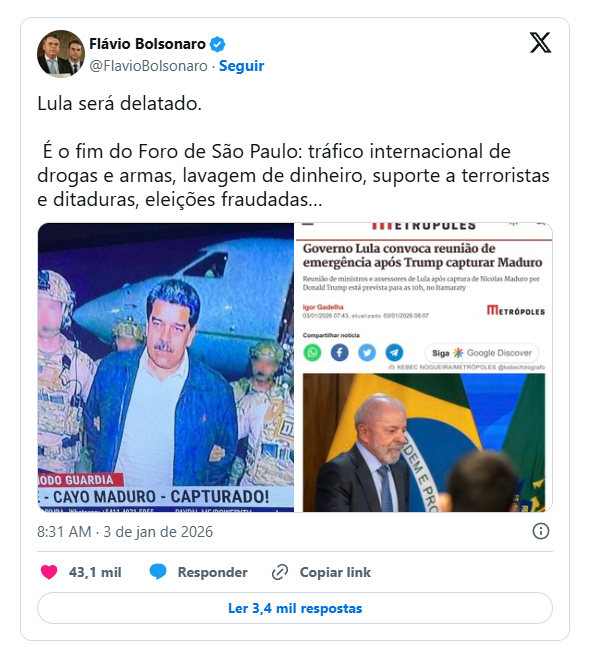 A investigação tem origem em uma postagem feita pelo senador em 3 de janeiro de 2026 na rede social X. Na publicação, Flávio associou imagens de Lula ao ditador venezuelano Nicolás Maduro e escreveu: