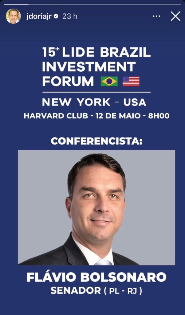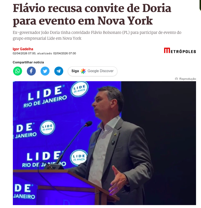 O senador Flávio Bolsonaro (PL-RJ) recusou o convite feito pelo ex-governador de São Paulo, João Doria, para participar do Lide Brazil Investment Forum 2026, evento empresarial que ocorrerá em Nova York no mês de maio, de acordo com a matéria do Metrópoles.