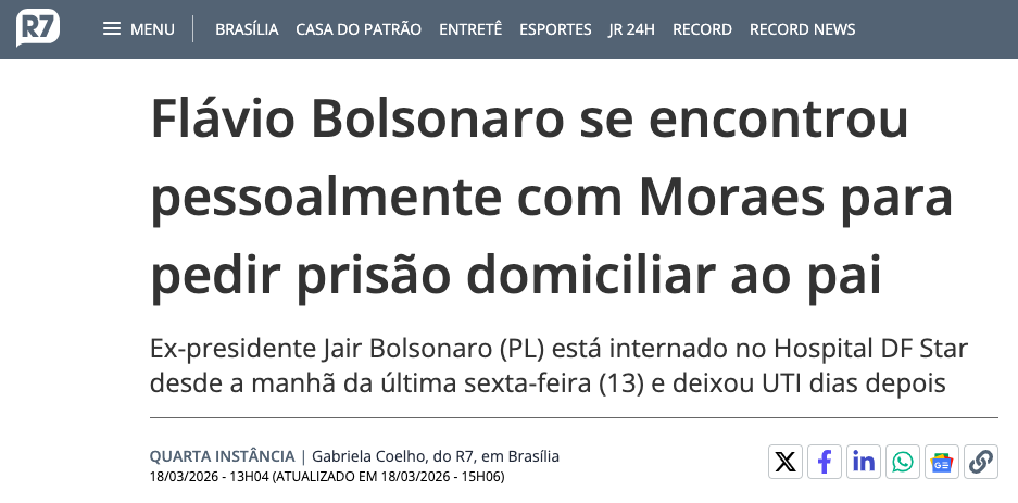 O senador Flávio Bolsonaro (PL-RJ) esteve pessoalmente com o ministro Alexandre de Moraes, do Supremo Tribunal Federal (STF), na noite de 17 de março para reforçar o pedido de domiciliar humanitária para o presidente Jair Bolsonaro.