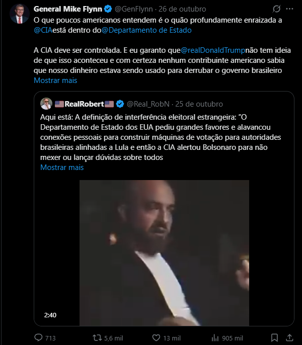 “Poucos americanos entendem o quão profundamente a CIA está inserida dentro do Departamento de Estado. A CIA precisa ser contida. E eu garanto que Donald Trump não tem ideia de que isso aconteceu — e certamente nenhum contribuinte sabia que nosso dinheiro estava sendo usado para derrubar o governo brasileiro.” Ele também mencionou perfis institucionais e políticos dos EUA, exigindo explicações e responsabilização.Michael Flynn é uma figura proeminente no setor de inteligência dos Estados Unidos.