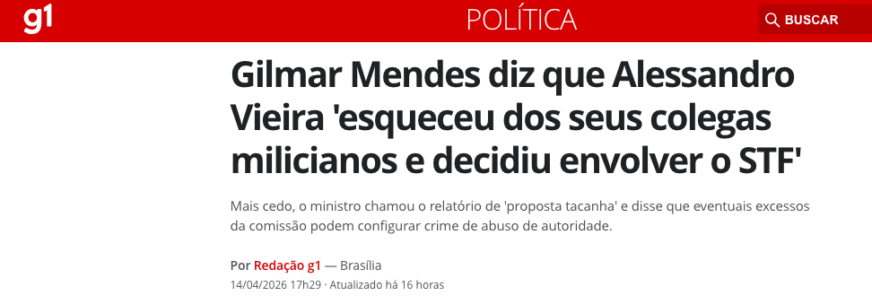 O ministro Gilmar Mendes, do Supremo Tribunal Federal (STF), criticou duramente o senador Alessandro Vieira (MDB-SE), relator da CPI do Crime Organizado, durante sessão da Segunda Turma na terça-feira (14 de abril de 2026), de acordo com a matéria do G1.