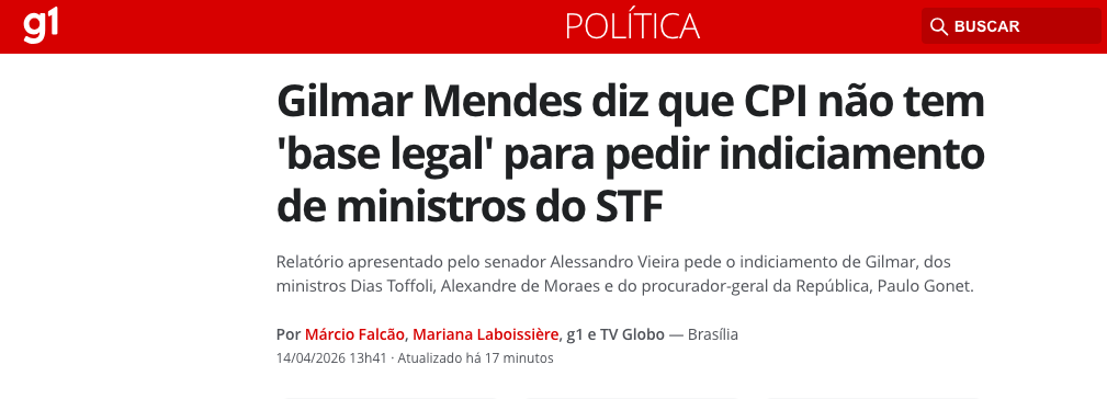 Em declaração nesta terça-feira (14 de abril de 2026), Gilmar Mendes afirmou: “O pedido do relator da CPI do Crime Organizado, voltado ao indiciamento de ministros do STF sem base legal, nos leva a uma reflexão sobre o papel e os poderes das CPIs”.