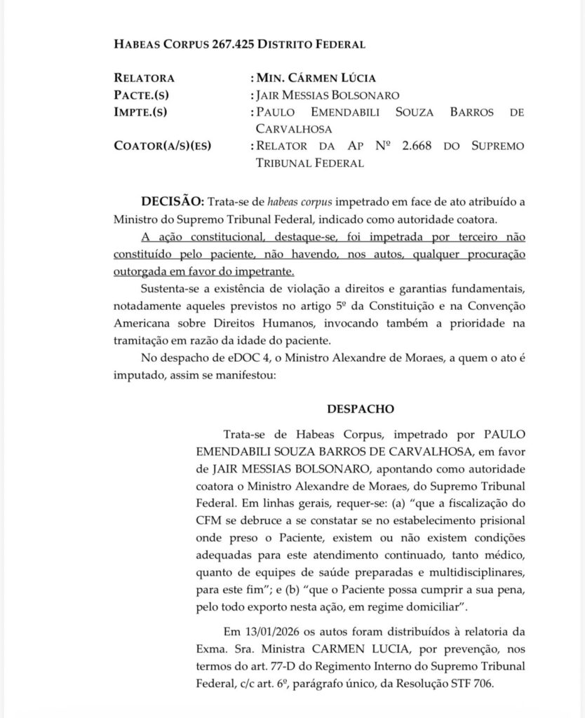 O habeas corpus em questão havia sido encaminhado ao decano na sexta-feira (16) pelo ministro Alexandre de Moraes, que se declarou impedido de julgar o caso por ser a autoridade coatora apontada na petição (responsável pelas decisões que mantêm Bolsonaro preso).