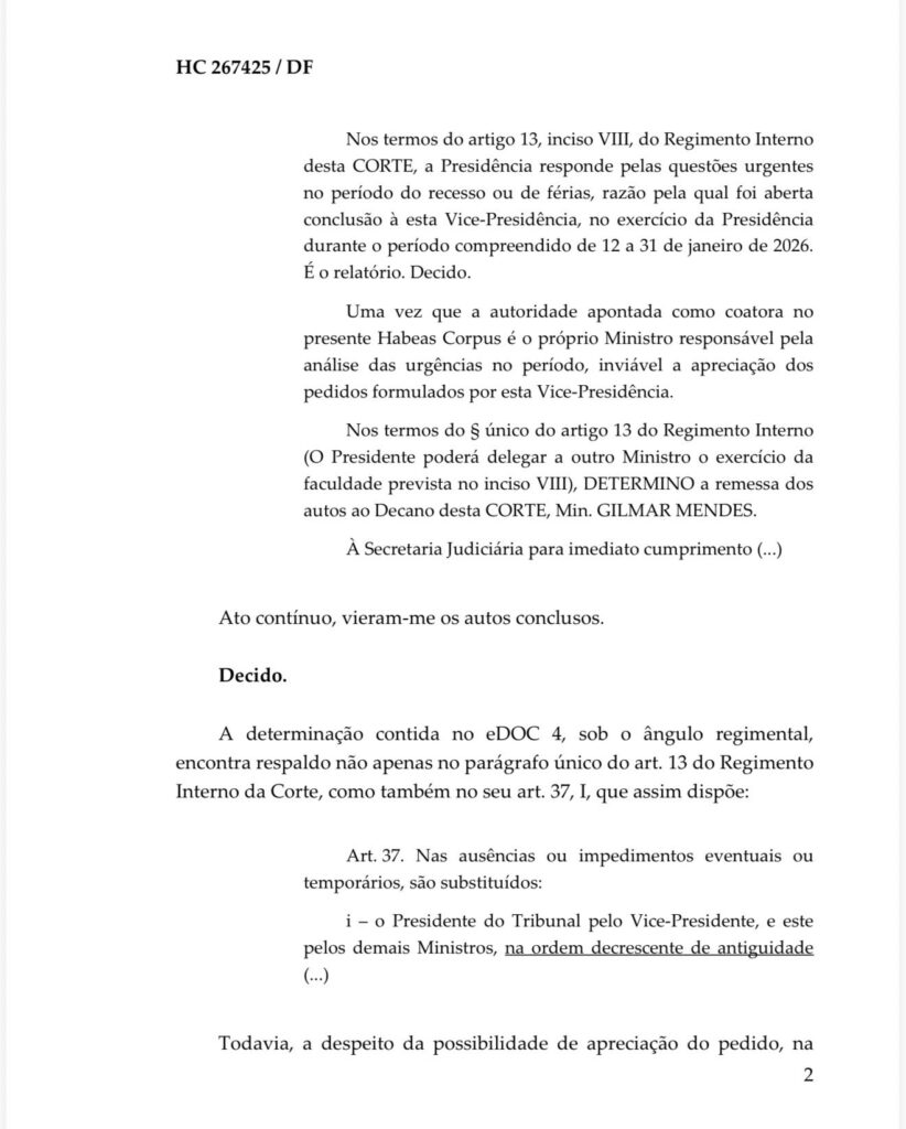 A negativa ocorre em meio ao recesso judiciário (de 12 a 31 de janeiro), período em que decisões urgentes ficam concentradas na presidência interina (ocupada por Moraes) ou delegadas.