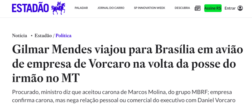O ministro Gilmar Mendes, do Supremo Tribunal Federal (STF), viajou em um avião de uma empresa ligada a Daniel Vorcaro, controlador do Banco Master, logo após participar da posse de seu irmão, Geraldo Mendes, como desembargador do Tribunal de Justiça de Mato Grosso, de acordo com a matéria do Estadão.
