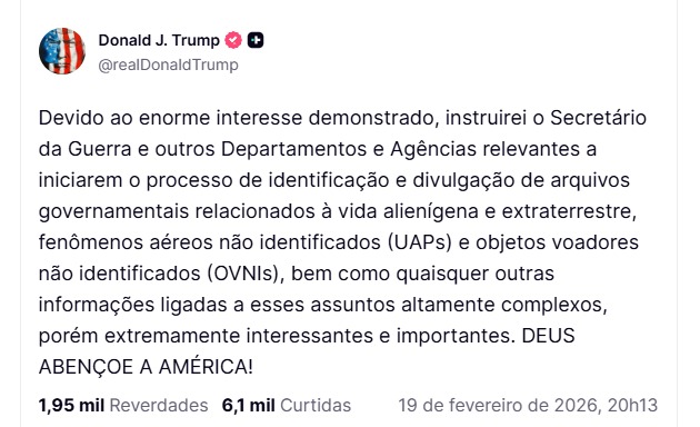 O presidente Donald Trump anunciou nesta quinta-feira (19) que instruiu o Secretário da Defesa e outros departamentos e agências do governo federal a iniciarem o processo de identificação e liberação de documentos oficiais relacionados a “vida alienígena e extraterrestre, fenômenos aéreos não identificados (UAPs) e objetos voadores não identificados (OVNIs)”.