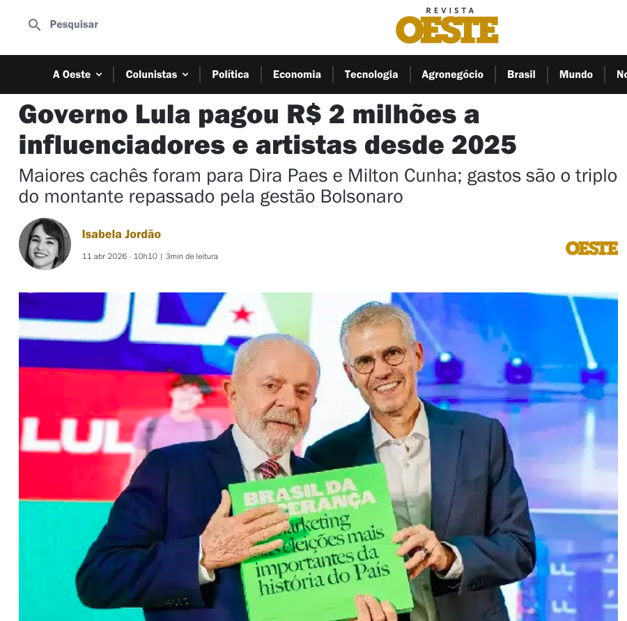 O governo do petista Lula da Silva gastou cerca de R$ 2 milhões desde o início de 2025 para contratar influenciadores digitais e artistas em campanhas publicitárias oficiais. Os recursos foram utilizados para divulgar ações e programas do governo em redes sociais e plataformas digitais, de acordo com a matéria da Revista Oeste.