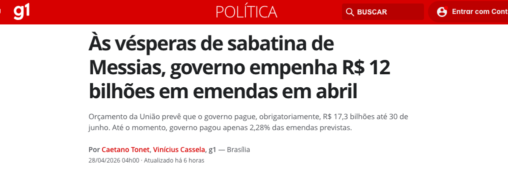 O governo federal acelerou significativamente o empenho de emendas parlamentares neste mês de abril. Apenas nas últimas semanas, foram empenhados cerca de R$ 12 bilhões em recursos destinados a parlamentares, um movimento que coincide com a proximidade da sabatina do advogado-geral da União, Jorge Messias, indicado por Lula para o Supremo Tribunal Federal (STF).
