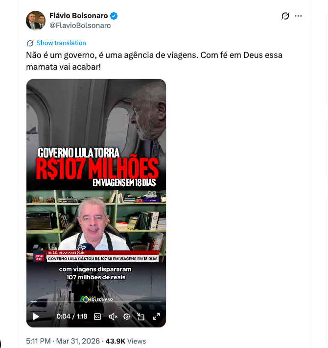 Despesas com diárias de servidores e passagens aéreas disparam no início de 2026; senador Flávio Bolsonaro critica: “Não é um governo, é uma agência de viagens. Com fé em Deus essa mamata vai acabar!”