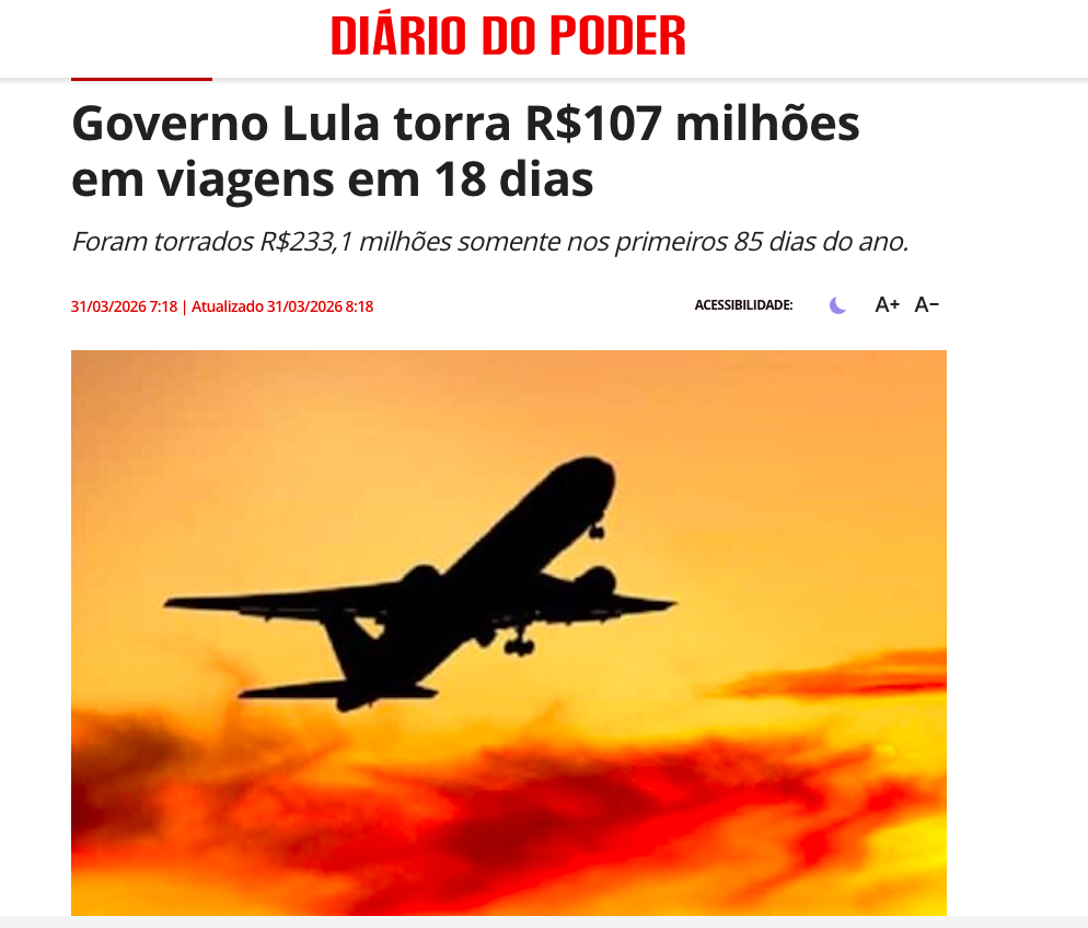 As despesas do governo federal com viagens registraram forte alta no mês de março. Segundo dados do Portal da Transparência, o Executivo gastou mais de R$ 107 milhões em apenas 18 dias, entre 9 e 27 de março de 2026, de acordo com a matéria do Diário do Poder.