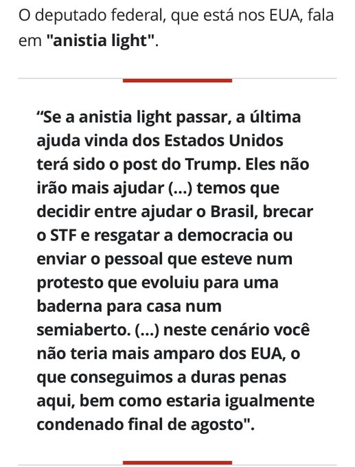 O parlamentar rejeita qualquer sugestão relacionada à anistia que não seja de forma ampla, geral e irrestrita. Em uma outra manifestação, ele reforçou: