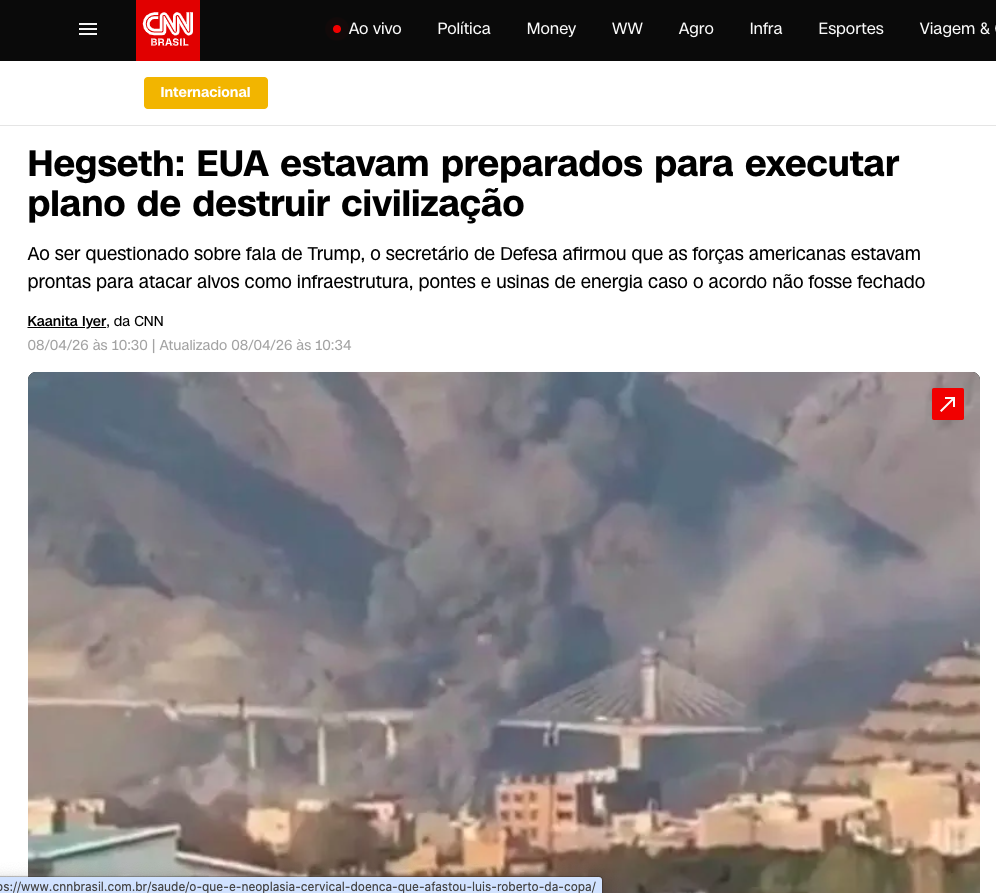 O secretário de Defesa dos Estados Unidos, Pete Hegseth, afirmou que as forças americanas estavam totalmente preparadas para executar um plano de grande escala contra o Irã caso o cessar-fogo não fosse fechado, de acordo com a matéria da CNN.