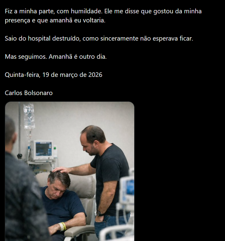 Nas redes socias, Carlos Bolsonaro relatou seu dia após visitar seu pai, Jair Bolsonaro. O pré-candidato ao senado em Santa Catarina revelou que hoje foi um dos dias mais difíceis.