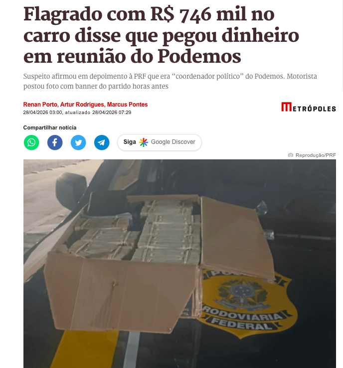 Um homem foi detido pela Polícia Rodoviária Federal (PRF) transportando R$ 746 mil em dinheiro vivo escondidos no banco traseiro de um carro. Segundo o próprio suspeito, o grande volume de notas foi retirado de uma reunião do partido Podemos em São Paulo.