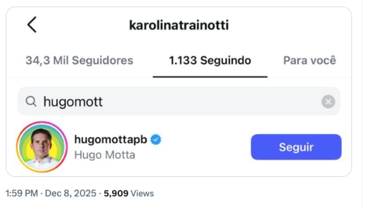 O presidente da Câmara dos Deputados, Hugo Motta (Republicanos-PB), segue no Instagram a influenciadora Karolina Trainotti, de 29 anos, que se apresenta como “sugar baby” – termo usado para jovens que mantêm relacionamentos com homens mais velhos em troca de benefícios financeiros – e recebeu em doação um apartamento de R$ 4,3 milhões na região da Faria Lima, em São Paulo, de uma empresa ligada ao banqueiro Daniel Vorcaro, dono do Banco Master.