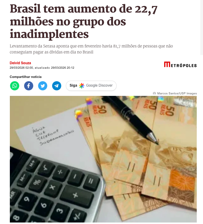 O número de brasileiros com dívidas em atraso cresceu de forma expressiva nos últimos dez anos, chegando a 81,7 milhões de pessoas em fevereiro de 2026. De acordo com dados da Serasa, o aumento foi de 22,7 milhões de inadimplentes no período, o que representa uma alta de aproximadamente 38,5% – bem acima do crescimento populacional de apenas 3,7% no mesmo intervalo, de acordo com a matéria do Metrópoles.
