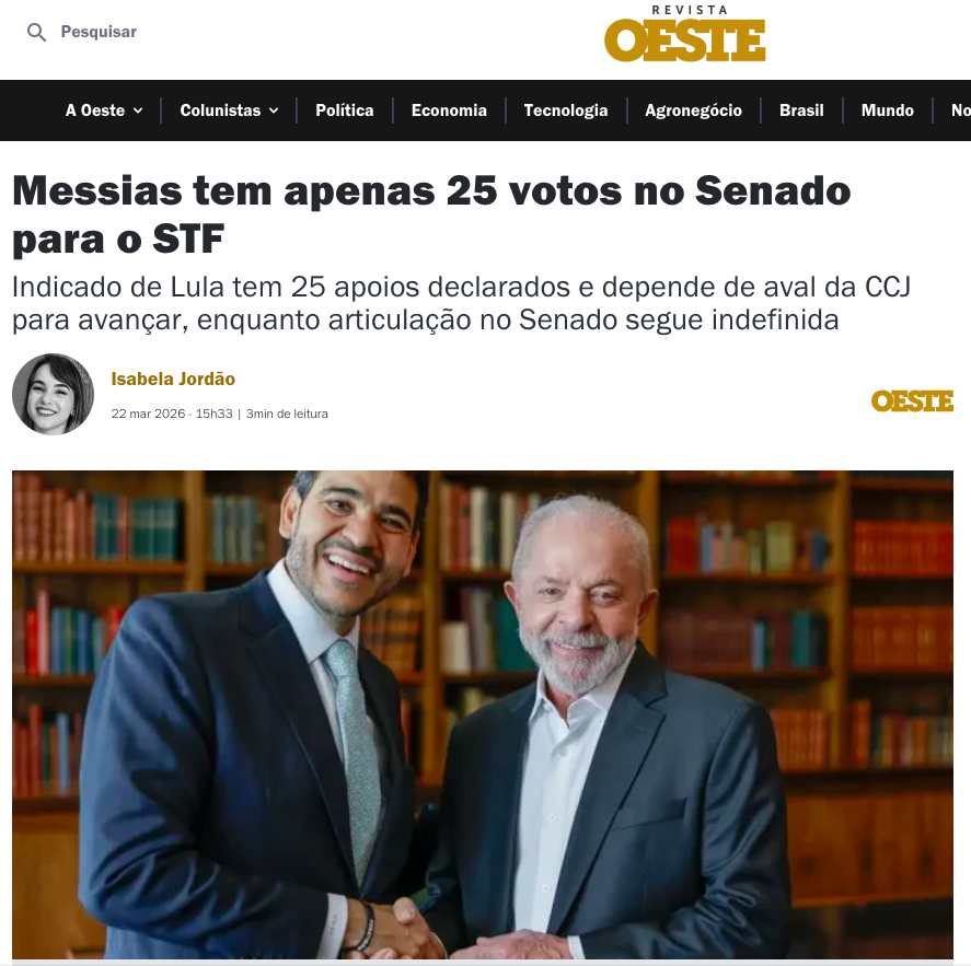 A indicação do advogado-geral da União, Jorge Messias, para ocupar uma vaga no Supremo Tribunal Federal (STF) segue com dificuldades no Senado Federal. De acordo com um levantamento realizado pelo portal Poder360 junto aos 81 senadores, o nome indicado pelo petista Lula da Silva conta atualmente com apoio declarado de apenas 25 parlamentares, de acordo com a matéria da Revista Oeste.