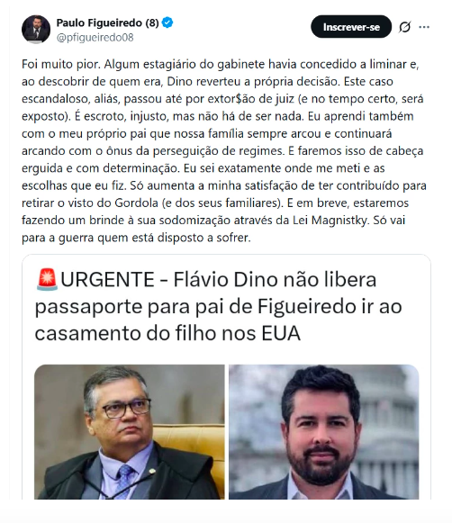 Home / Judiciário / INDIGNAÇÃO: Paulo Figueiredo reprova decisão absurda de Dino que impediu viagem do pai.